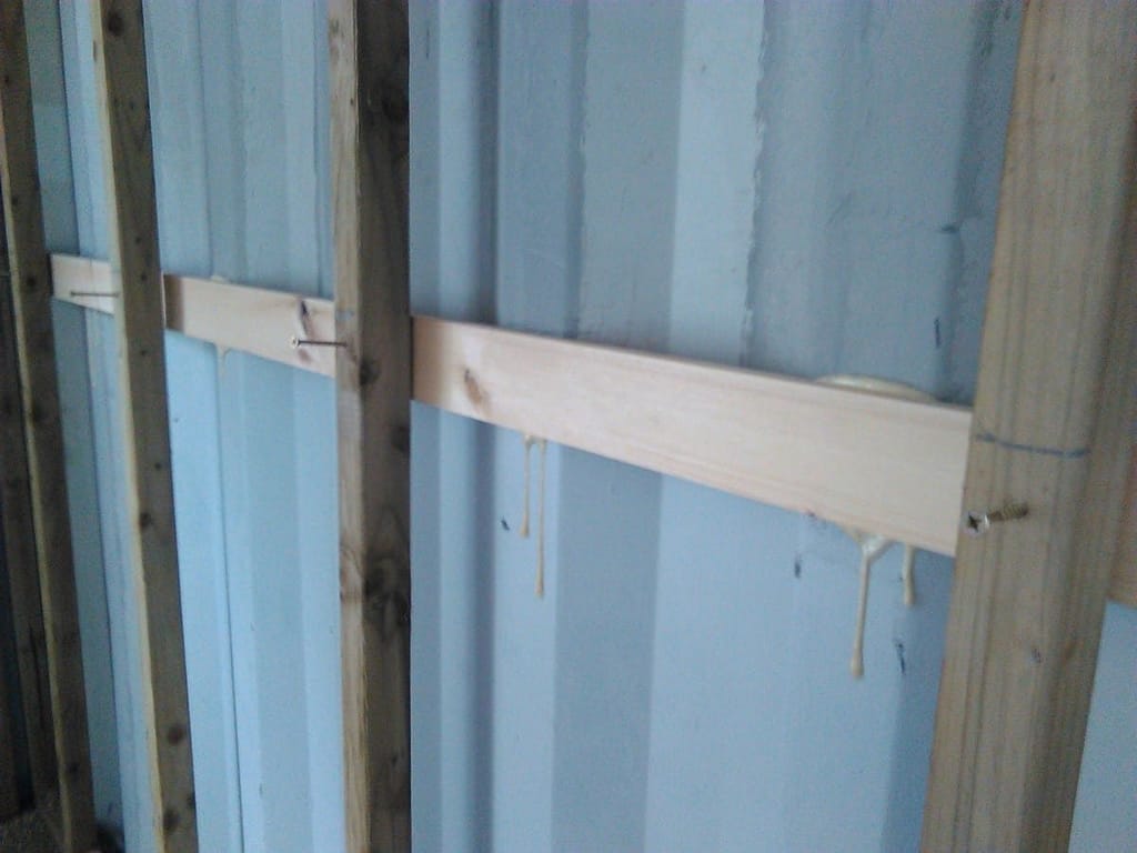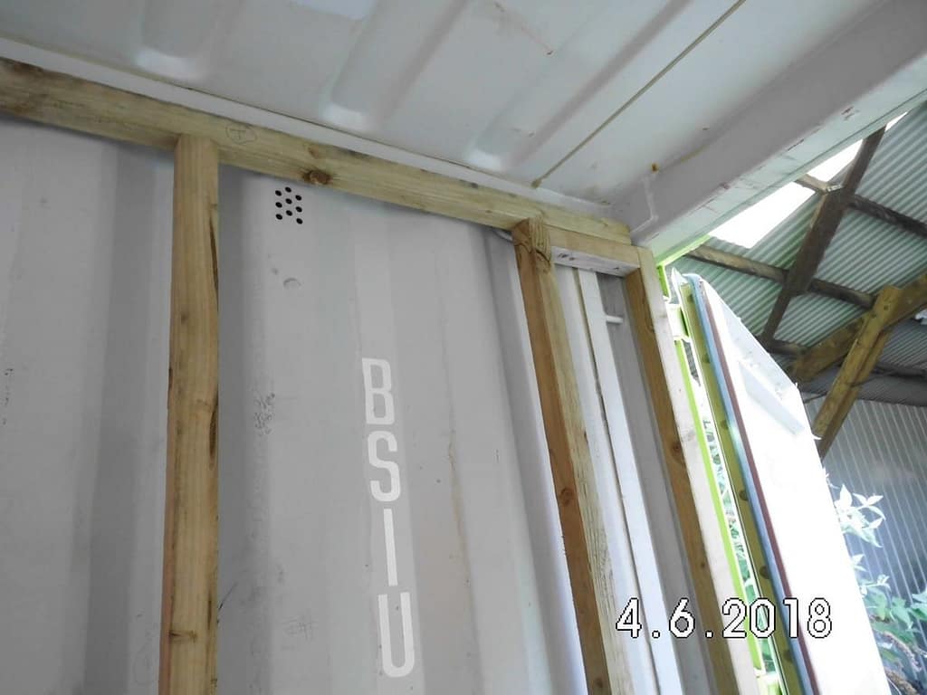 This is the end of the first full week on site and the green 40ft is virtually ready for spray insulating. I had planned to use 38 mm x 63 mm CLS. (CLS stands for Canadian Lumber Standard which has become the default standard for the building industry to use for stud walls. I think it is a bit weedy for general construction, but space is a priority here, and it will give us the depth we need for the 3″ of insulation which is the best we are going to be able to manage).