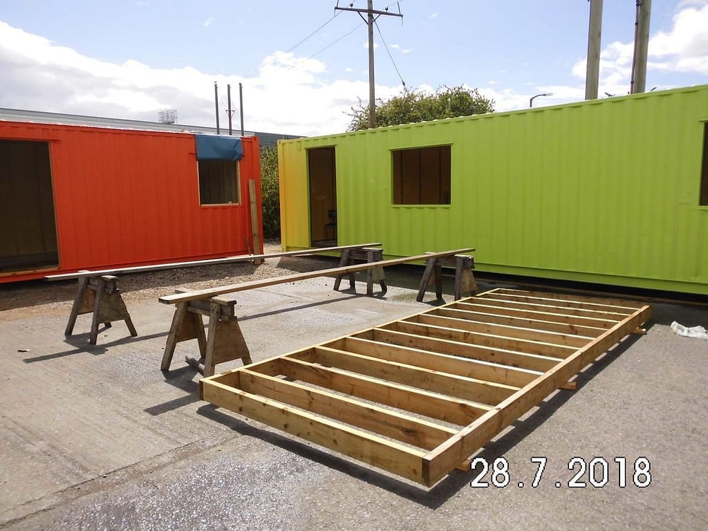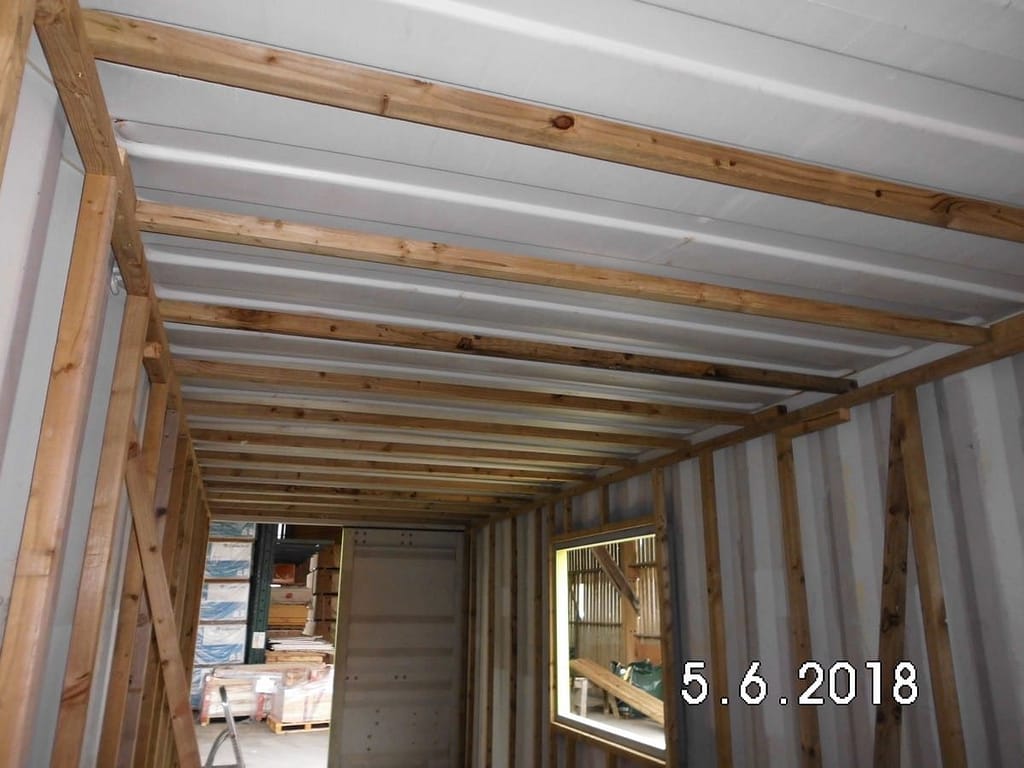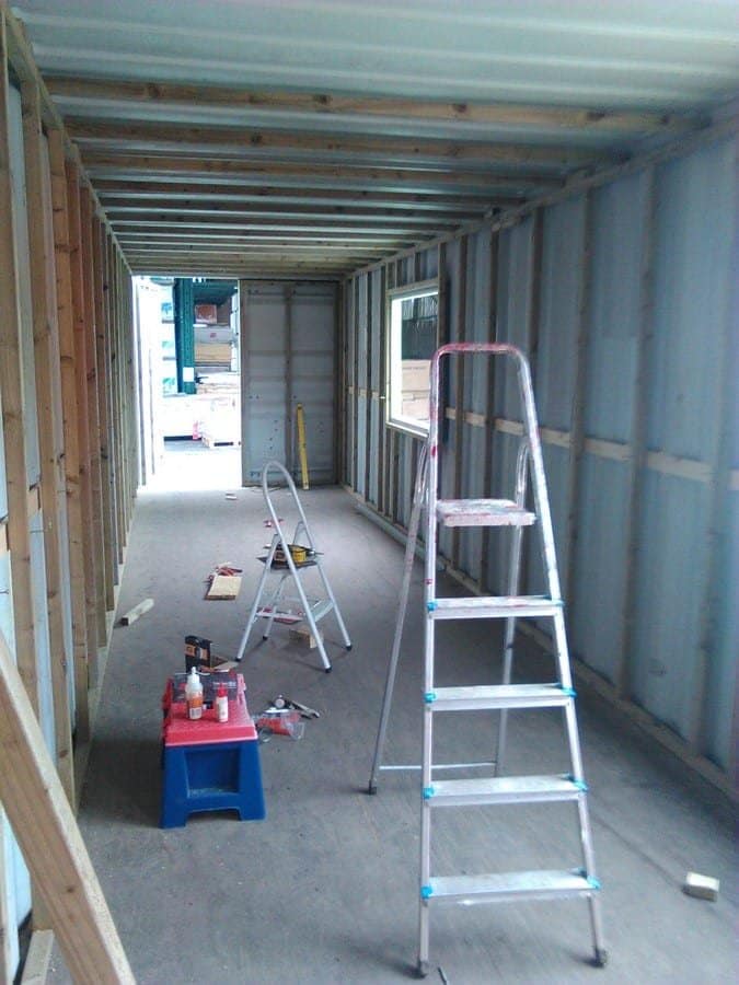 New space would normally supply these containers with a plywood floor but not of the same thickness as the 40 foot. We got them to put a metal floor under the floor joists instead. In this way we can insulate the floor to a good standard from the inside without losing head room.The picture on the right is the 40 foot with its timber stud framework ready for spraying.