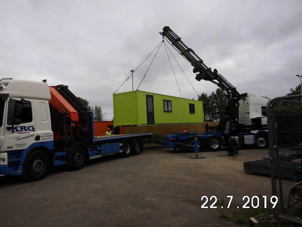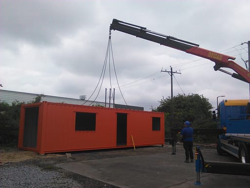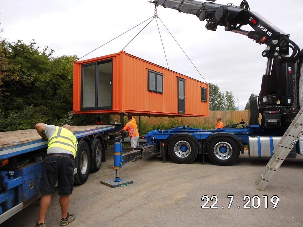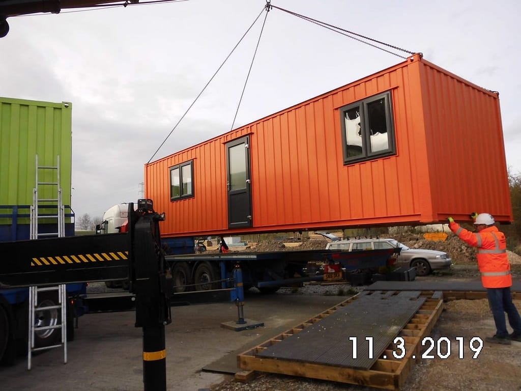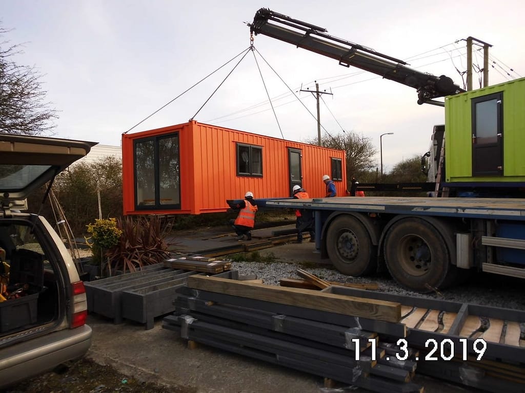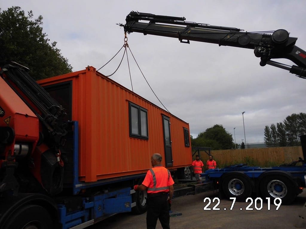 After the first full week on site the green 40ft is lifted ready for spray insulating. The result is visible on the base as the container is craned away.