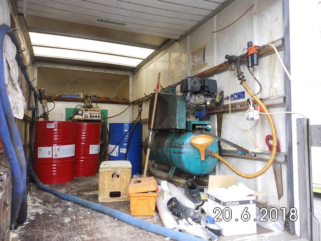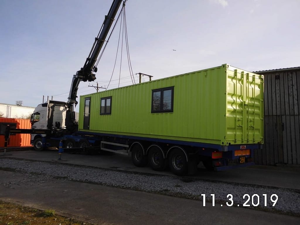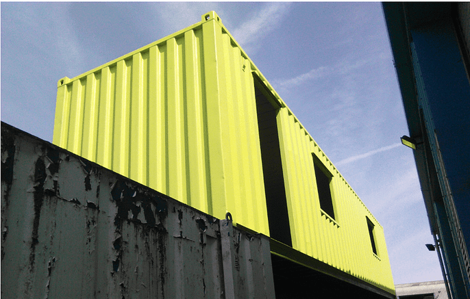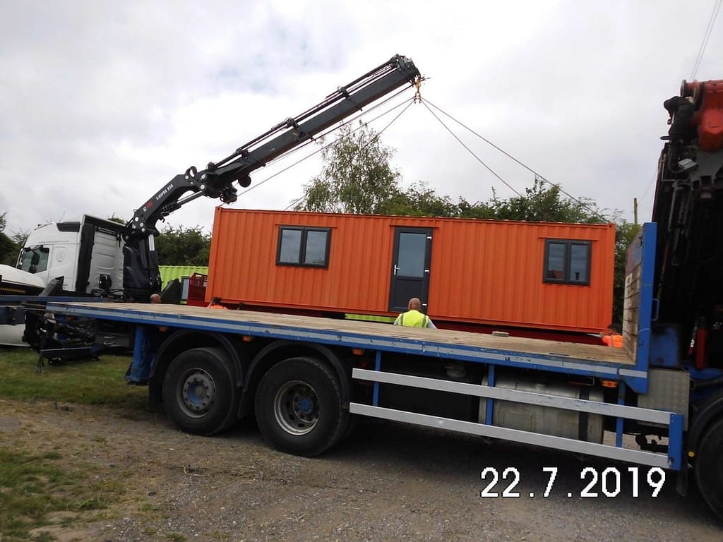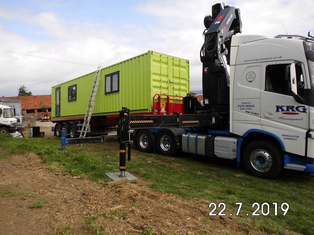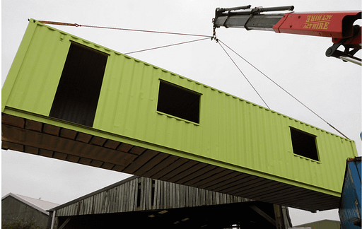 After the first full week on site the green 40ft is lifted ready for spray insulating. The result is visible on the base as the container is craned away.