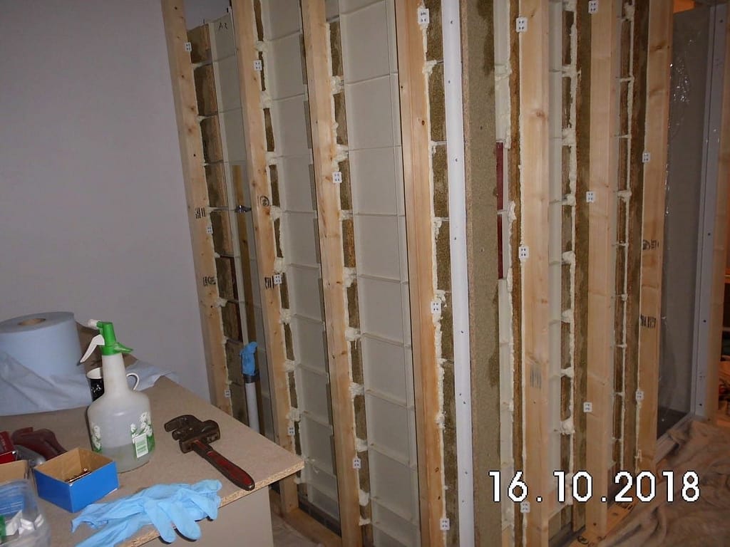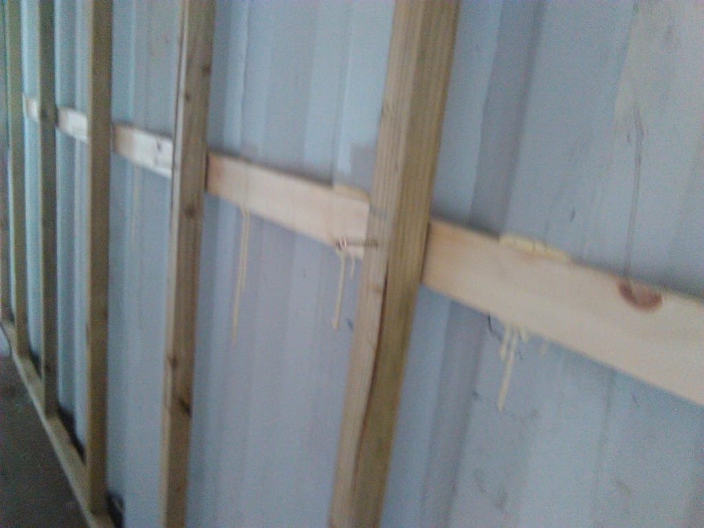 So, using a construction “Gorilla Glue” we glued the studs to the walls to hold everything in place until the insulation had set.