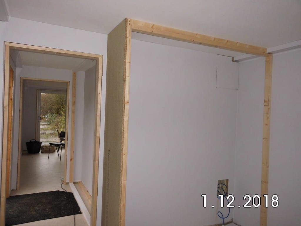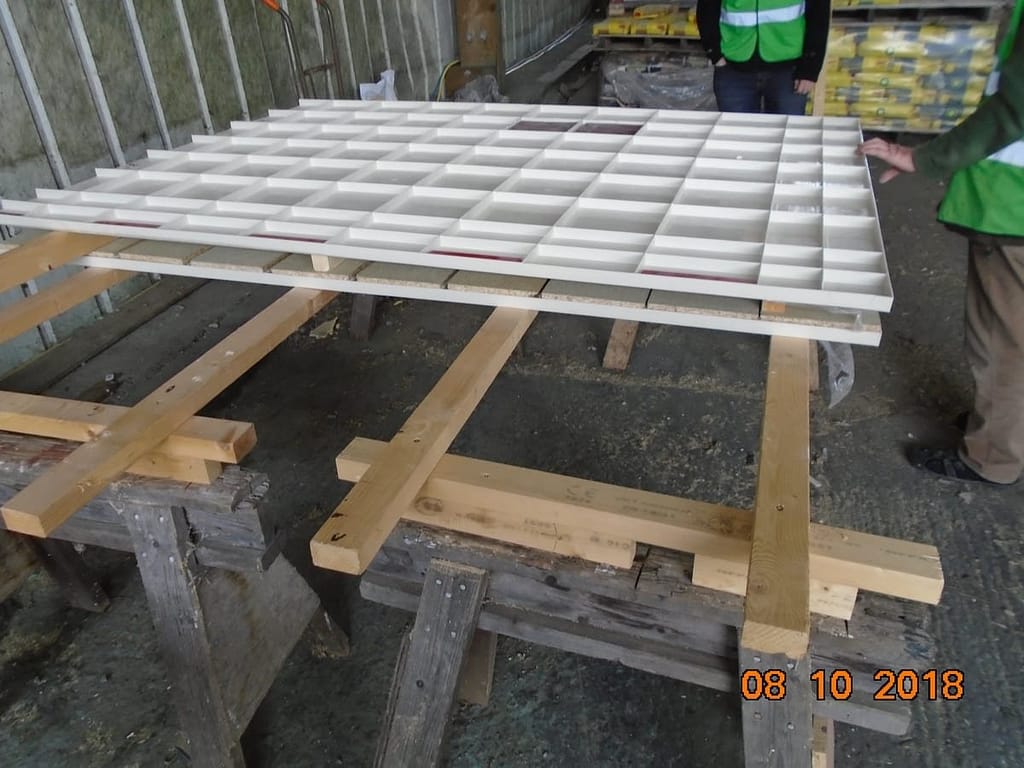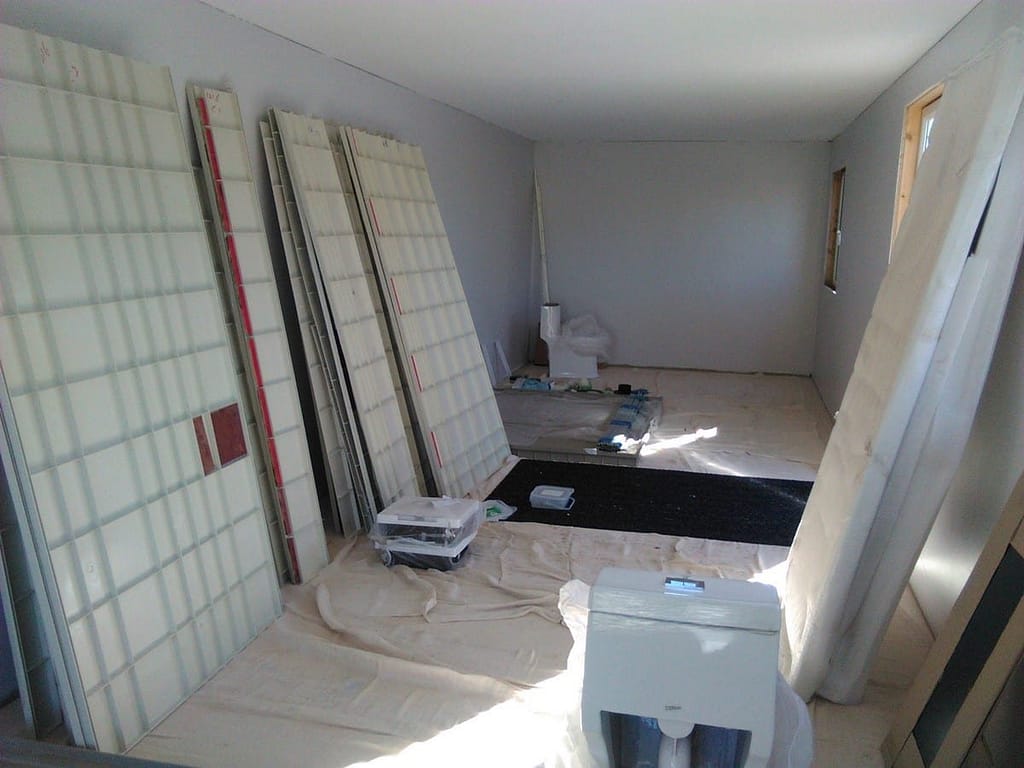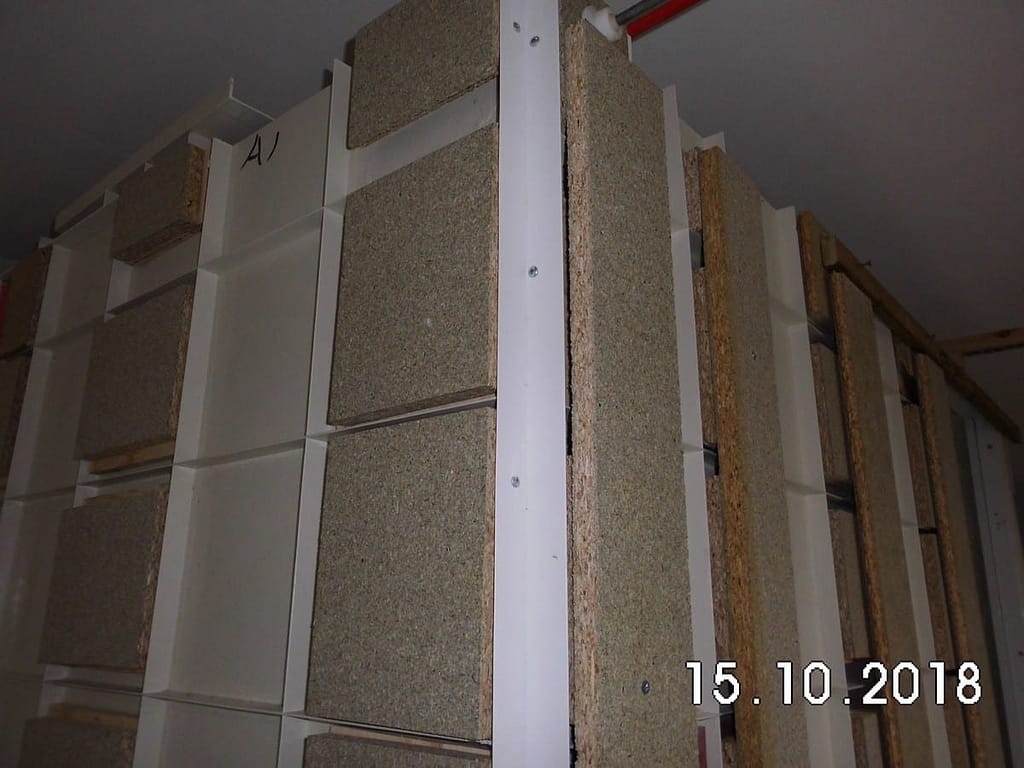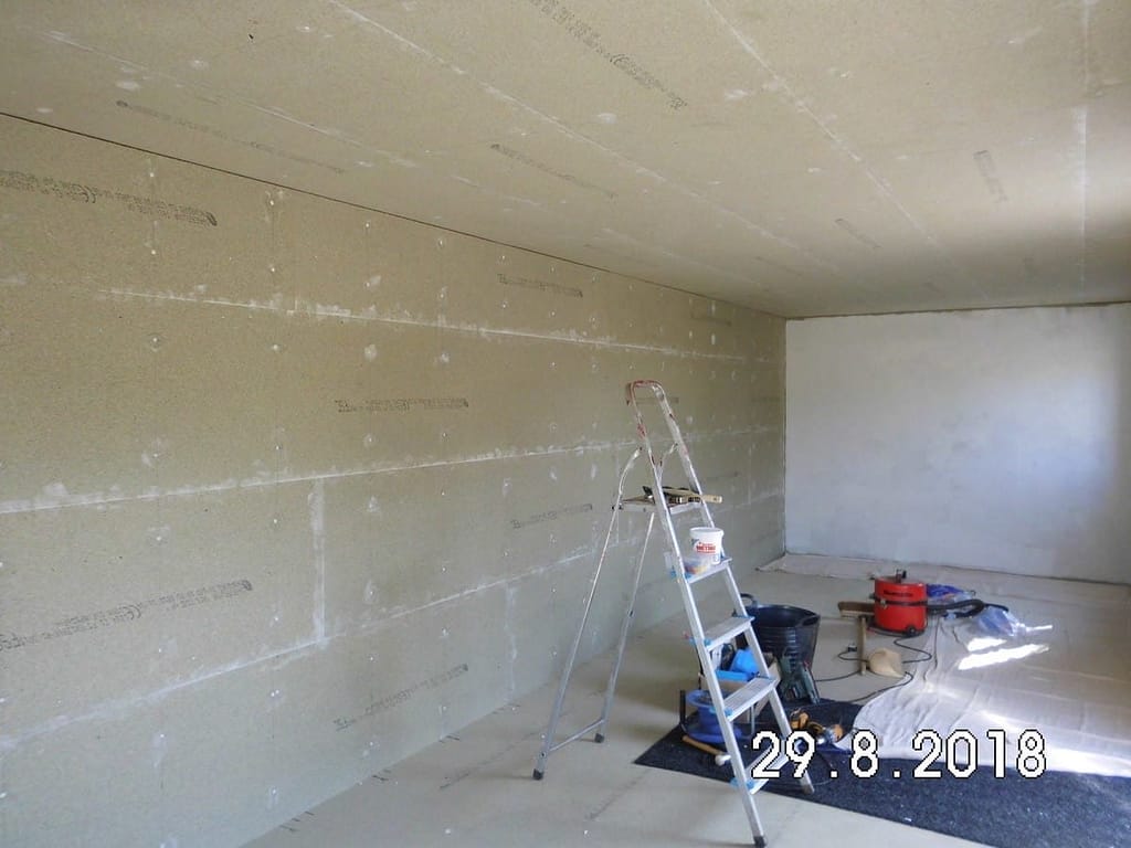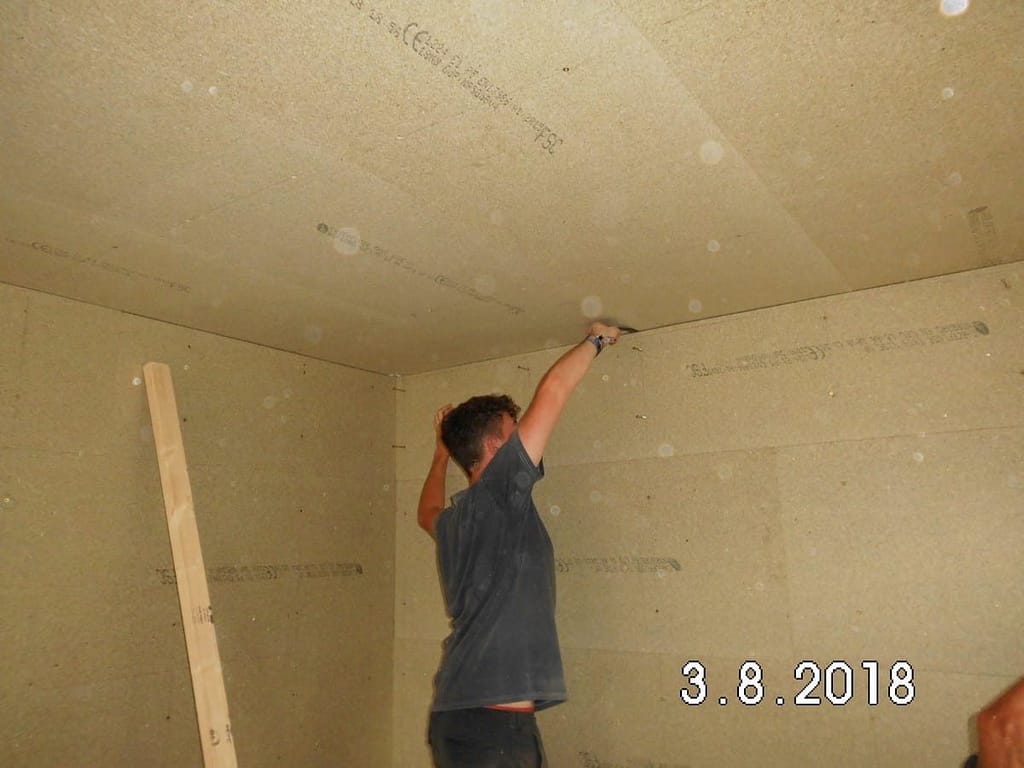 We are lining the floors, walls and ceilings with 18 mm tongued and grooved flooring chipboard, which comes in 2400 mm x 600 mm sheets. There are lots of very good reasons for doing this.It is strong, stable, relatively cheap and easy to handle. It is also easy to put in for unskilled people.