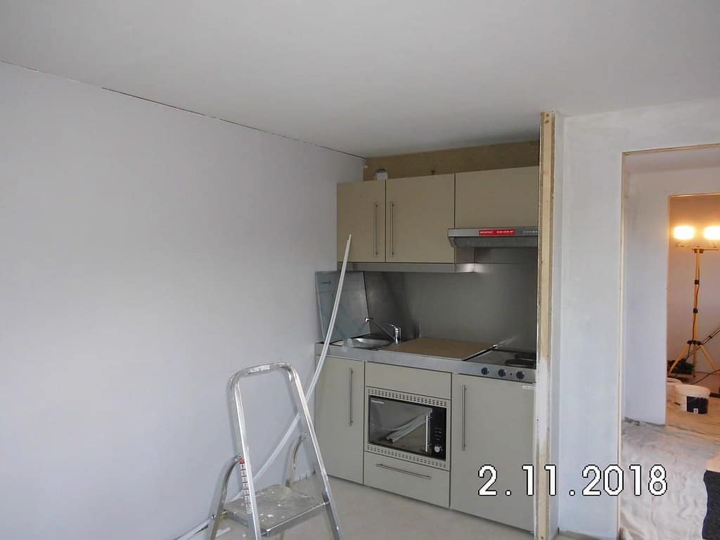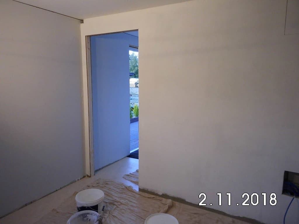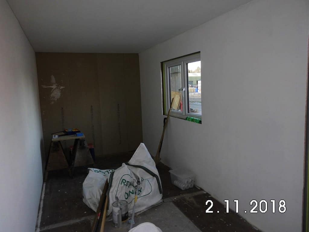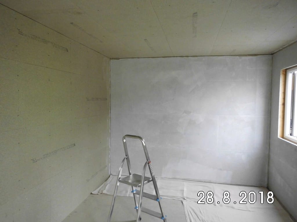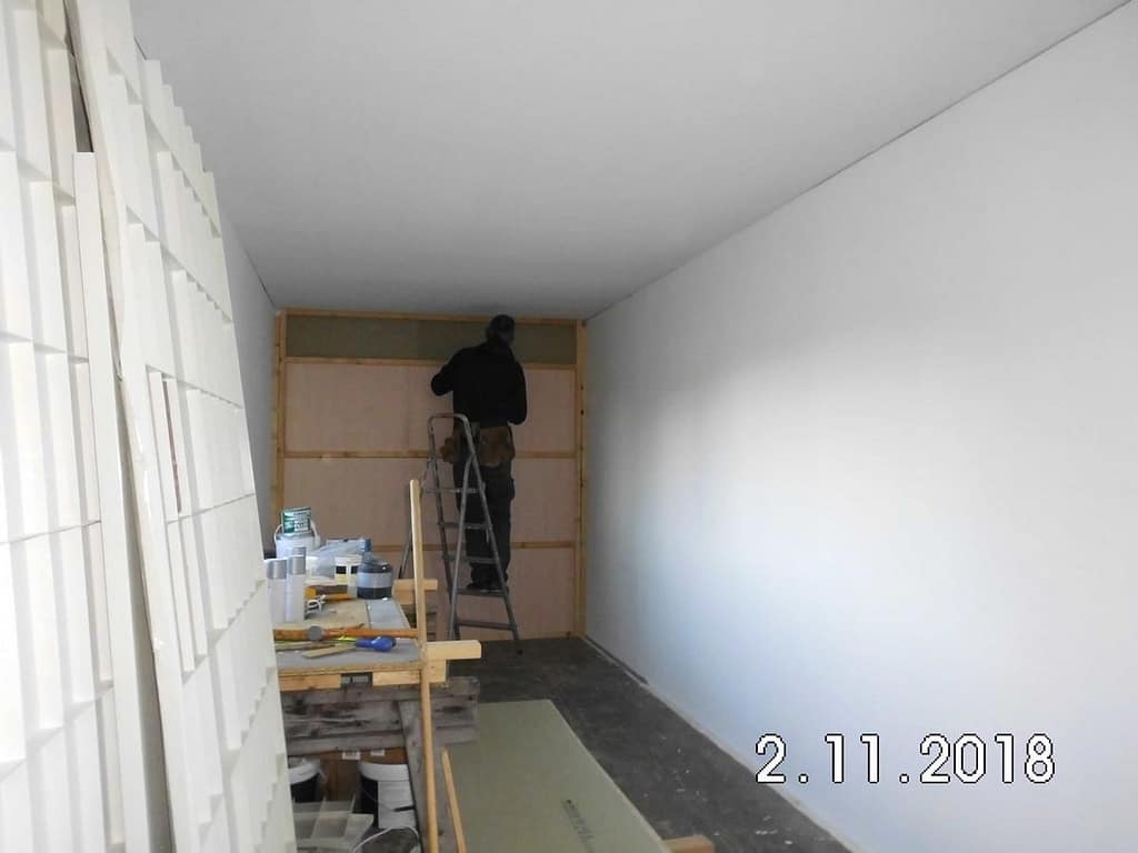 Nevertheless it is bloody hard work especially on the ceiling working above your head all the time. We may have made life more difficult for ourselves by getting 3″ of insulation on studwork on average only three and a half inches off the wall.