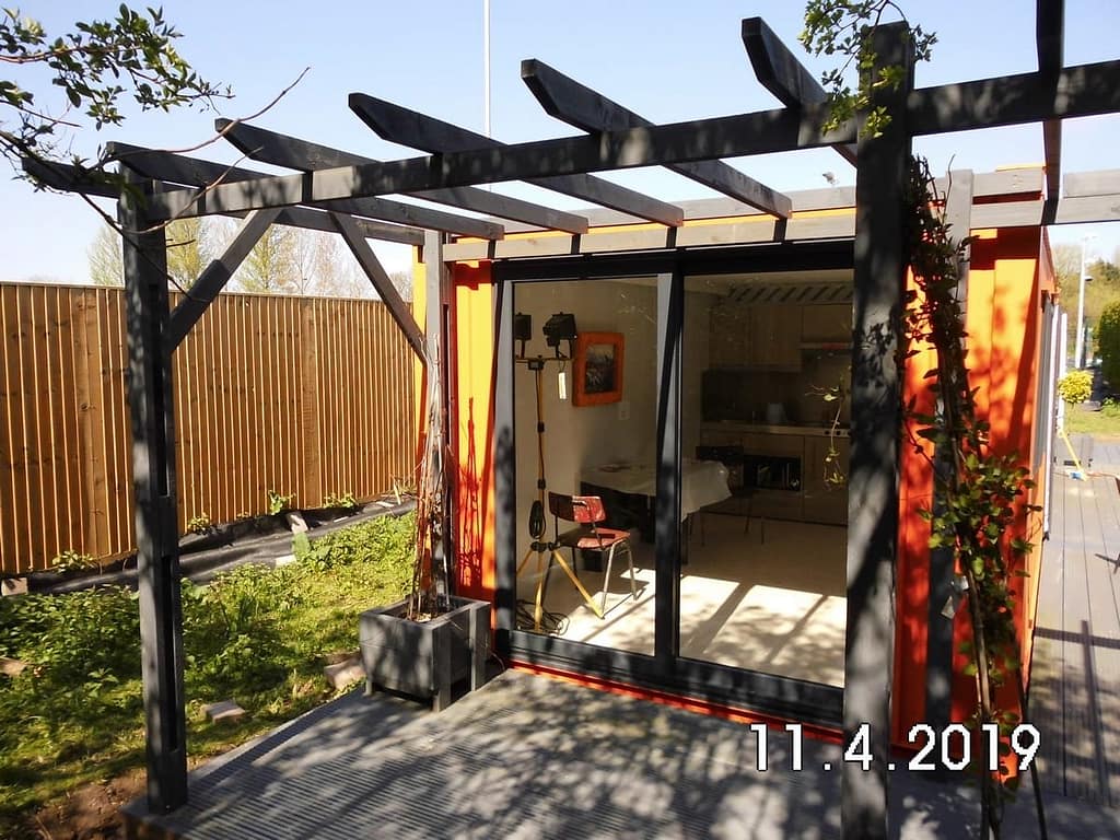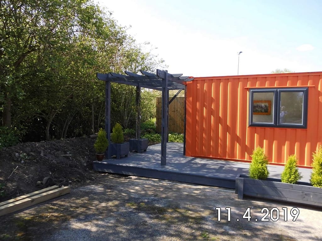 This project is all about a technical feasibility, design and construction process. But it is also about selling an idea. We want it to look good as well, so we are putting in some decking and a pergola at the patio door end of the orange one. We are not just selling the idea to the politicians and decision makers. We want them to look like a good place to live to those who are going to occupy them!However, it is the only bit of the project which is not likely to find a permanent home so we didn’t want to spend any more than we had to!Travis Perkins had sorted out a load of timber which wasn’t up to standard mostly because it had warped or split so we made a sensible contribution to Macmillan Cancer Support which is the charity they support and we got a great deal. It is harder to work with if it is all a bit wonky of course, but that is what old builders are good at.