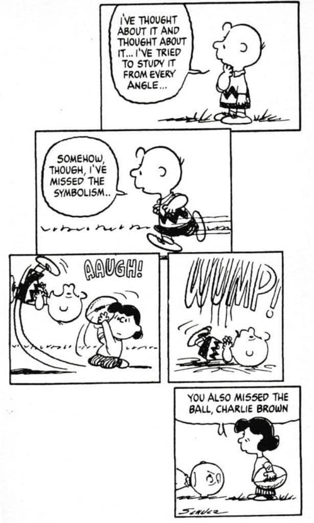 For those of you unfamiliar with Charlie Brown, Lucy often holds the ball so that Charlie can run up and kick it as they do in rugby and American football. She unfailingly removes it at the last moment so that Charlie tumbles A over T. Even if she insists she won’t, she always does. And Charlie never learns. He is the eternal optimist.