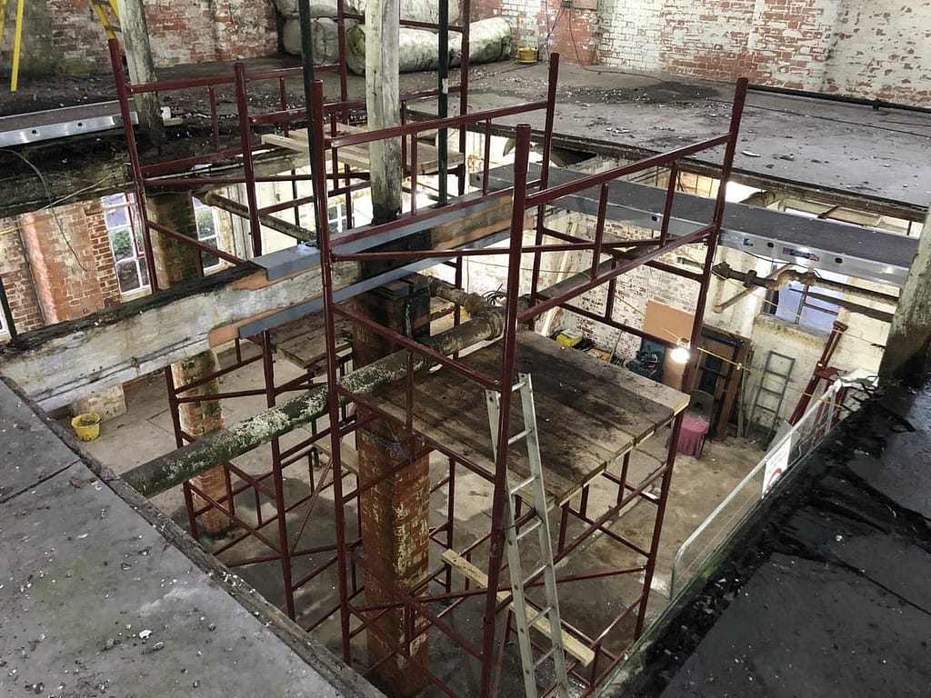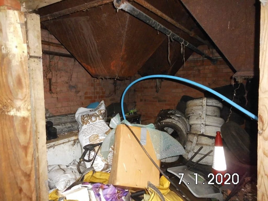 So we began work clearing the dust extraction tower in January 2020. Actually “We” is an exaggeration. I started, and it was filthy and disgusting. This was in part due to Stuart having left a freezer half full of food and ice lollys in 2012 and buggered off, and in no small measure to Chris Black who had gone to a great deal of effort to make it the ideal pigeon loft and had done pretty well. It was deep in pigeon shit, and junk covered in pigeon shit.