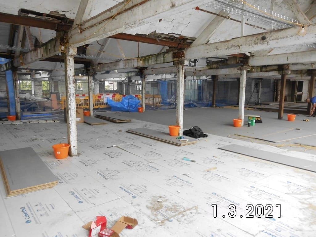 The section below is a good example. At least part of it may finish up being left open so that there is height to put in some climbing wall or rope sections for the youth club. However, we will put joists and temporary decking over all the key areas to provide safe working platforms for the roof repair.