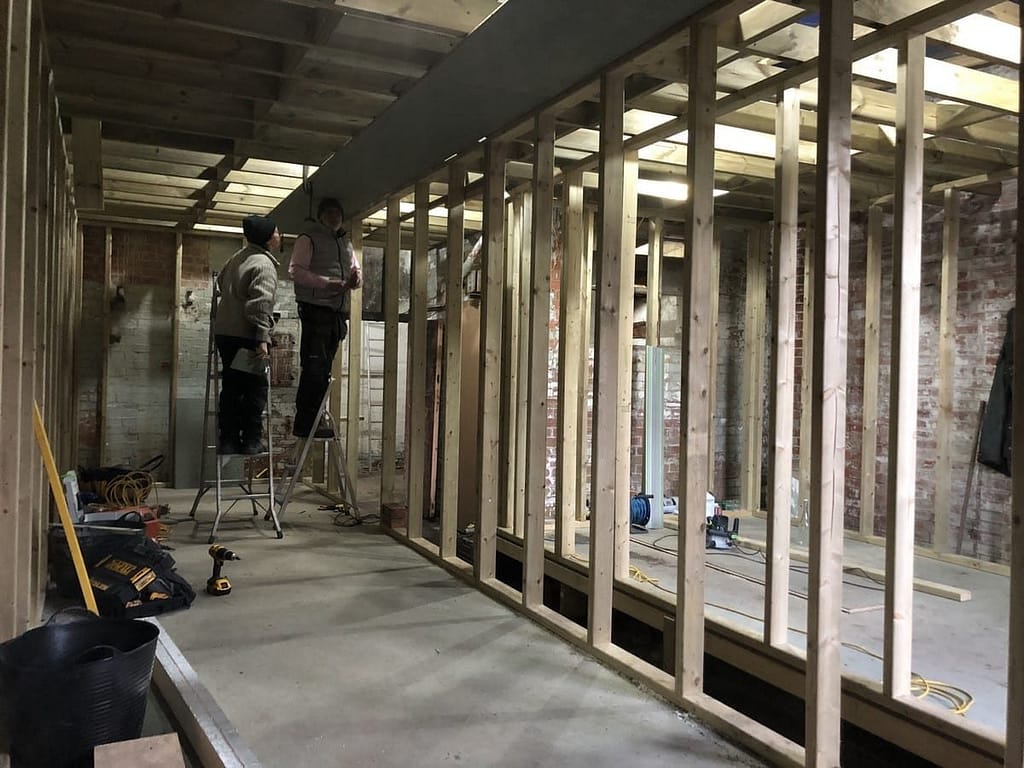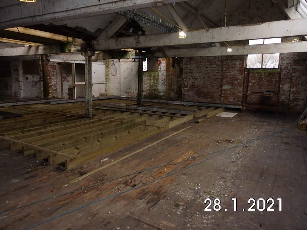 The rotten sections have now been removed and new joists are mostly in place. Our engineer has deemed the remaining floor “good enough” to be strengthened which will bring the whole thing up to the same level.