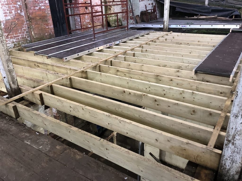 We will gradually replace the floor as we go, but to avoid getting the floor wet straight away we will use staging boards on the old floor and new joists.